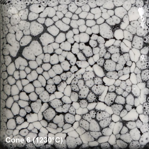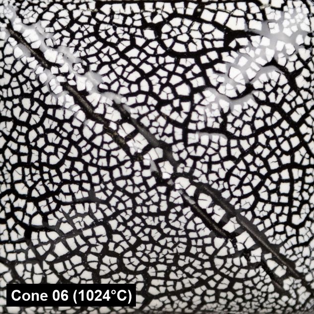 Kegel 06 (1024°C) Oxidation: Ein weißes, zersplittertes Muster aus erhabenen, unregelmäßigen Schuppen entsteht. Die darunterliegende Glasur wird in den Rissen sichtbar.