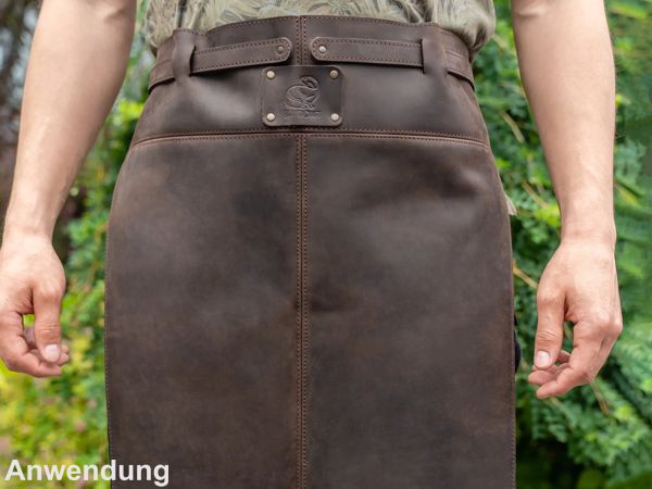 Dieses einzigartige Holzschnitzschürzenmodell ist aus strapazierfähigem Material gefertigt – natürliches braunes Crazy Horse Leder von ausgezeichneter Qualität. Die Reinigung von Schmutz und Fett nach Gebrauch ist ein Kinderspiel.