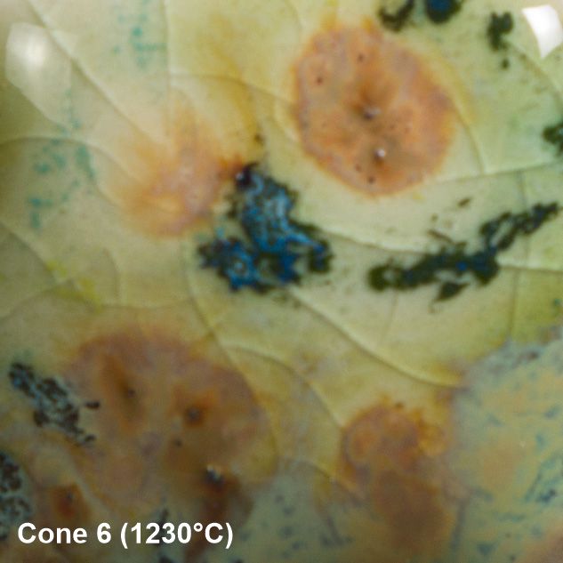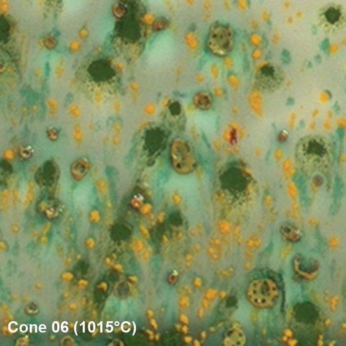 Anwendung: Vor jeder Anwendung gut schütteln und umrühren, um die Kristalle in der Glasur zu verteilen. Verwenden Sie einen Fächerpinsel und tragen Sie 2-3 gleichmäßige Schichten auf geschrühte Keramik (Cone 04, 1060 °C) auf. Zwischen den Schichten trocknen lassen. Während des Auftragens der dritten Schicht müssen die Kristalle möglicherweise neu verteilt werden, um eine gleichmäßige Abdeckung zu gewährleisten. Vermeiden Sie es, Kristalle in die Nähe des Bodens des Werkstücks zu platzieren, da die Kristalle aufgrund ihrer Fließeigenschaften verlaufen können. Gut trocknen lassen. Brennen Sie die Glasur bei Cone 06/05 (999 °C – 1046 °C). Besuchen Sie MaycoColors.com für vollständige Sicherheitsdaten (SDS) und weitere Produktinformationen. Beim Brennen schmelzen die Kristalle und erzeugen florale, lebendige Effekte, die sich perfekt mit der glasigen Grundfarbe verbinden. Besonders schön auf hellen Tonen oder schlichten Formen, die das Farbspiel in den Vordergrund rücken.