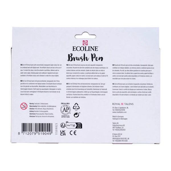 Talens Ecoline steht für Qualität, Leuchtkraft und kreative Freiheit. Die Farben basieren auf Farbstoff und Gummi Arabicum und überzeugen durch ihre Leichtigkeit und Ausdrucksstärke. Die Brush Pens sind sofort einsatzbereit, geruchlos und trocknen schnell – perfekt für alle, die spontan und mit Stil arbeiten möchten.