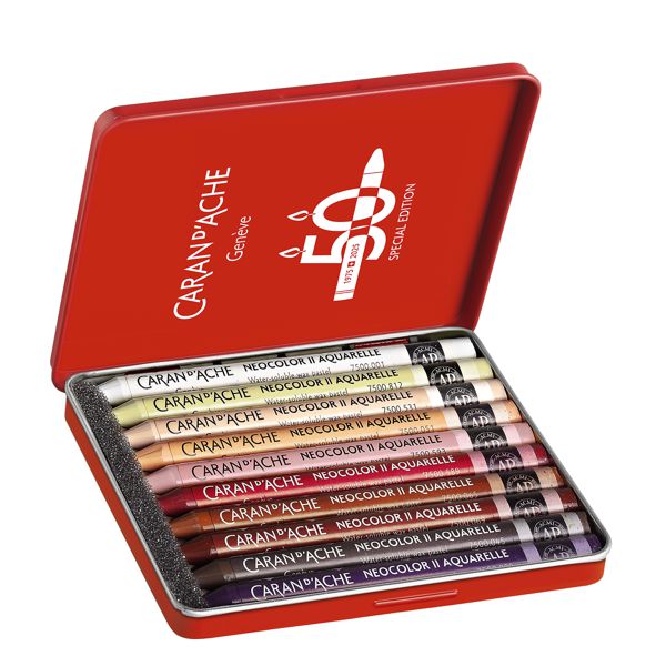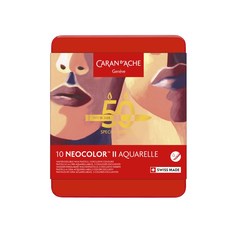 Zum 50-jährigen Jubiläum der ikonischen NEOCOLOR II Aquarellwachspastelle präsentiert Caran d’Ache eine streng limitierte Sonderedition, die Sammlerherzen und Kreativliebhaber gleichermaßen höherschlagen lässt. Das edle Metalletui enthält insgesamt 10 Farben – darunter 7 beliebte Standardtöne und 3 exklusive Sonderfarben, die ausschließlich in diesem Set erhältlich sind und nicht einzeln nachgekauft werden können.