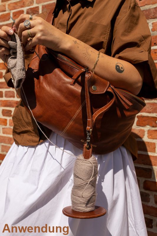 Der Project 094 Wollabwickler ist ein kompakter, drehender Yarn Holder aus hochwertigem Leder, entwickelt fürs Stricken & Häkeln „on the go“. Du setzt dein Knäuel auf die Basis – das Garn rollt gleichmäßig ab, ohne zu verknoten. Dank Befestigungsmöglichkeit lässt sich Project 094 simpel an Re:Designed-Project-Bags anklipsen; so hast du ihn immer dabei, sogar beim Gehen.