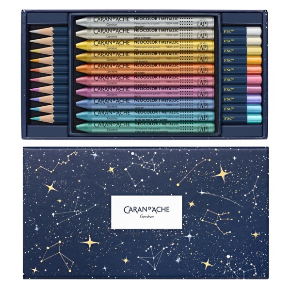 Caran d’Ache feiert Weihnachten mit der exklusiven COSMIC BLUE Kollektion – einer funkelnden Sonderedition, die mit metallischem Glanz inspiriert. Dieses Mixed Media Set enthält 10 brillante Metallic-Farbstifte und 10 NEOCOLOR™ I Metallic-Pastelle, die intensive Farben mit einzigartiger Leuchtkraft vereinen.