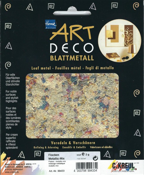 Der Blattmetall Metallic-Mix besteht aus hauchdünnen Flocken in Gold-, Silber-, Kupfer- und weiteren Metallic-Nuancen. Diese Mischung ermöglicht Ihnen eine außergewöhnliche Gestaltung mit schillernden Übergängen und edlen Akzenten. Die Flocken sind einfach zu verwenden und bieten ein luxuriöses Finish, das sowohl in modernen als auch in klassischen Designs überzeugt.