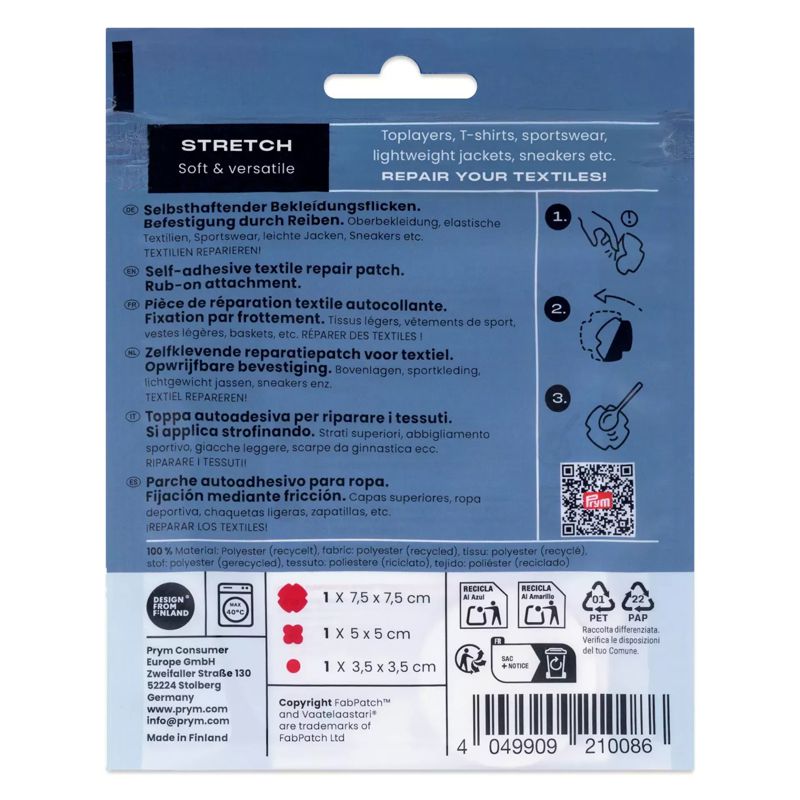 Die FabPatch STRETCH Reparaturflicken in verschiedenen Farben sind die ideale Lösung, um beschädigte Kleidung schnell und unkompliziert zu reparieren. Dank ihrer selbstklebenden Oberfläche haften sie zuverlässig auf elastischen und unelastischen Materialien wie Jersey, Nylon, Polyamid oder modernen Funktionsstoffen.